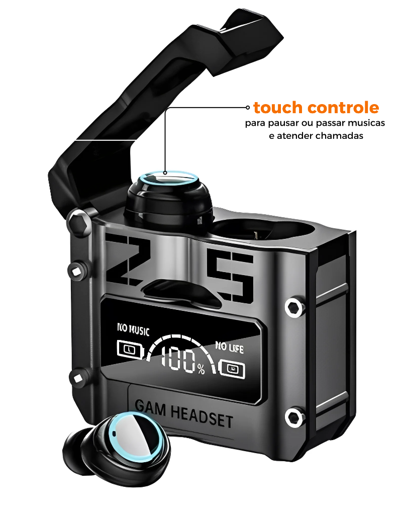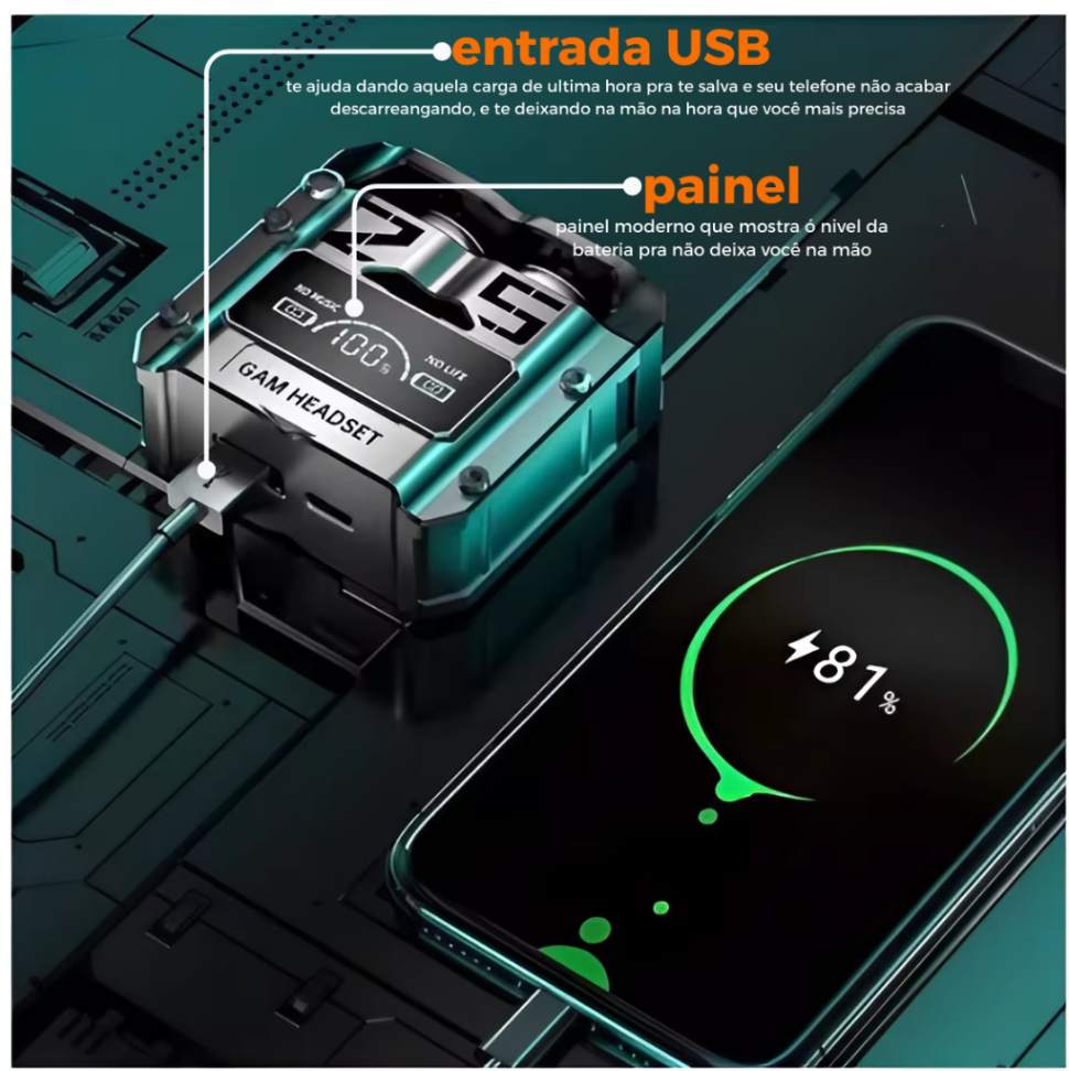 agora imagine ter um fone que entrega som imersivo, conexão moderna, controle fácil e ainda pode ajudar quando seu celular está sem bateria.